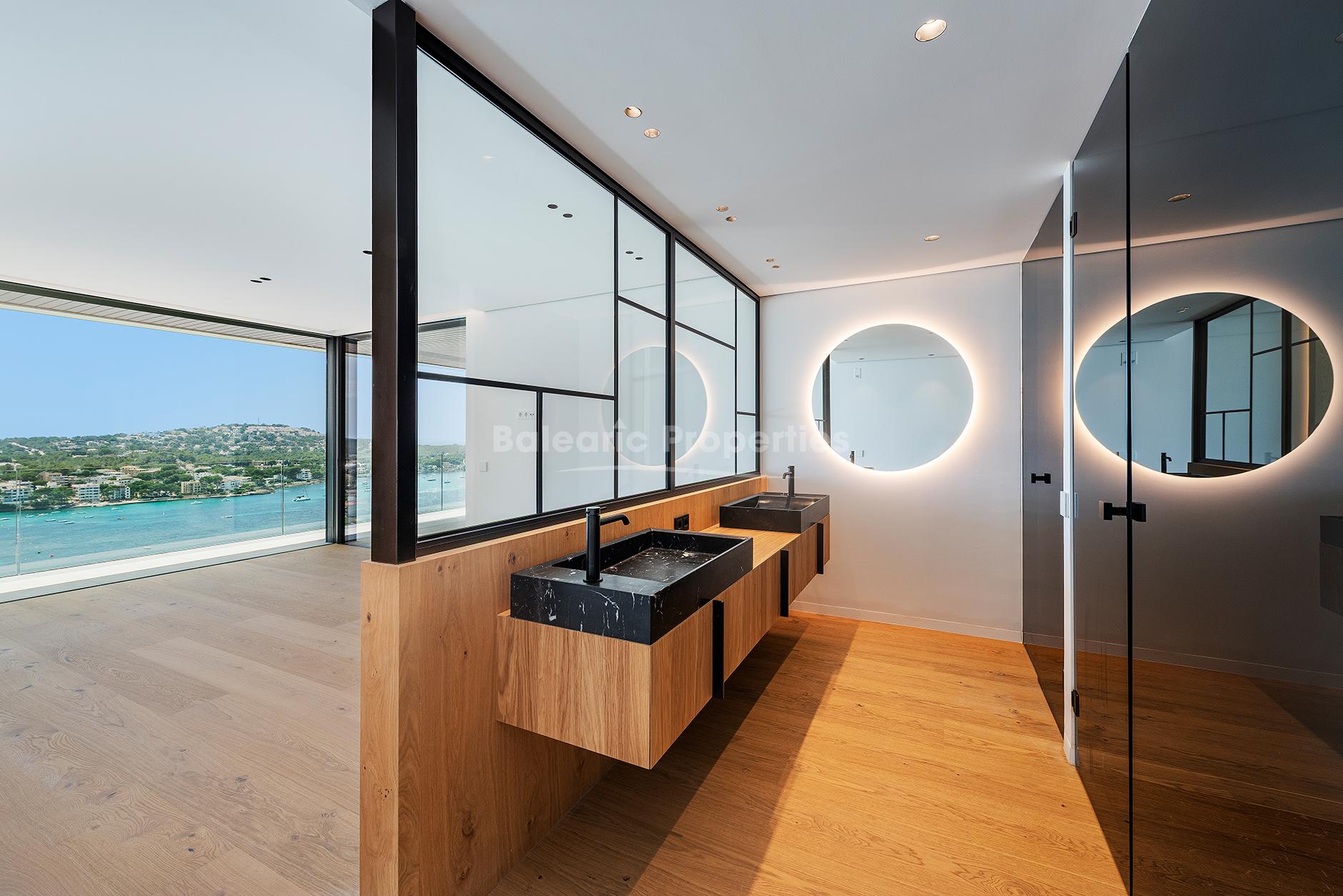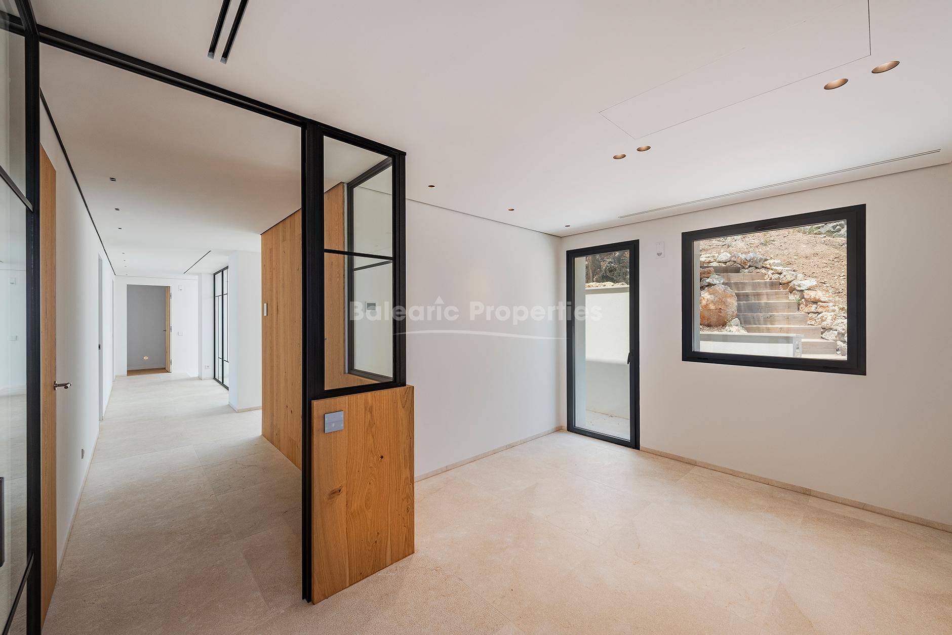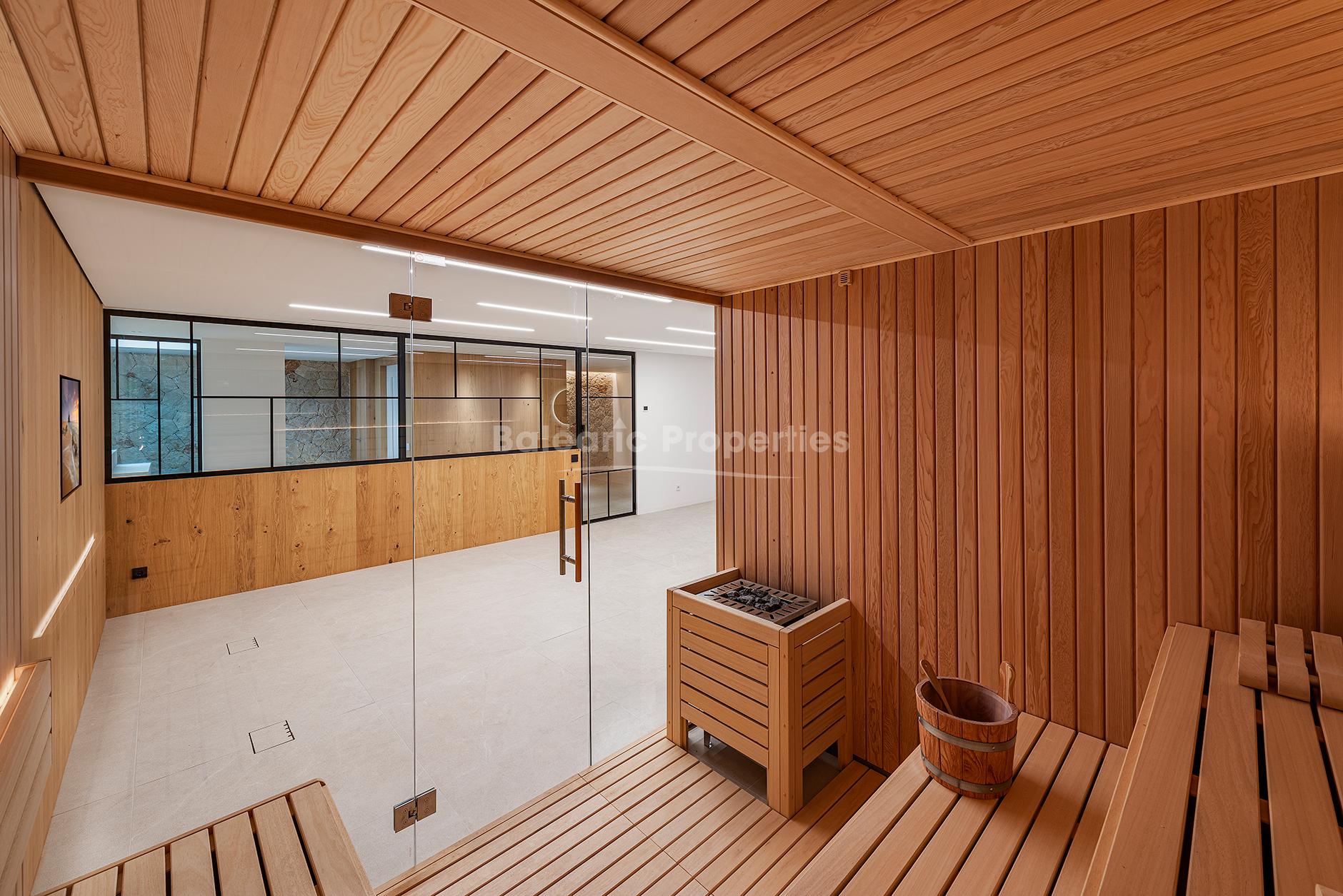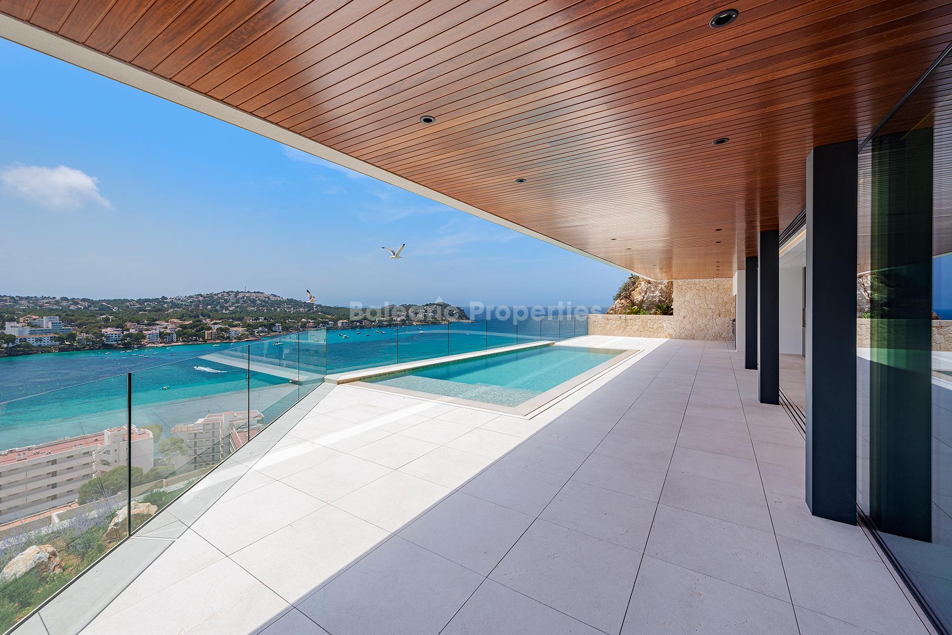 Diese moderne Villa, zum Verkauf in der begehrten Wohnlage Santa Ponsa, verbindet mediterranen Charme mit zeitgenössischer Architektur. Fertiggestellt im Jahr 2025 und auf drei Ebenen verteilt, ist die nach Süden ausgerichtete Immobilie den ganzen Tag über von reichlich natürlichem Licht durchflutet. Die erhöhte Lage bietet sowohl einen atemberaubenden Panoramablick auf das Meer, als auch auf die umliegenden Berge und schafft eine ruhige, offene Atmosphäre. Das Design legt Wert auf klare Linien, hochwertige Materialien und ein nahtloses Zusammenspiel von Innen- und Außenbereichen, das Haus ist ein elegantes und zugleich komfortables Familienheim.