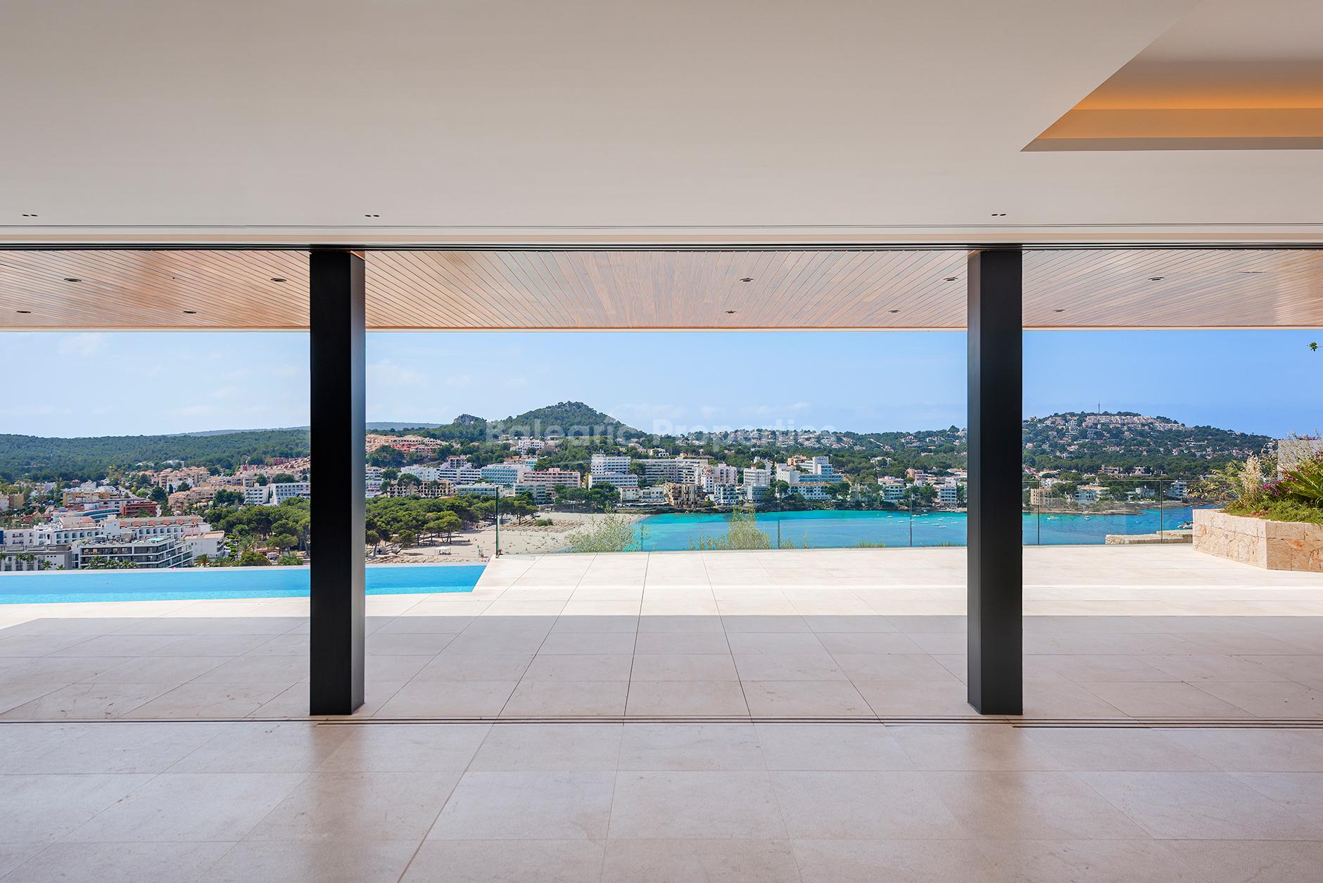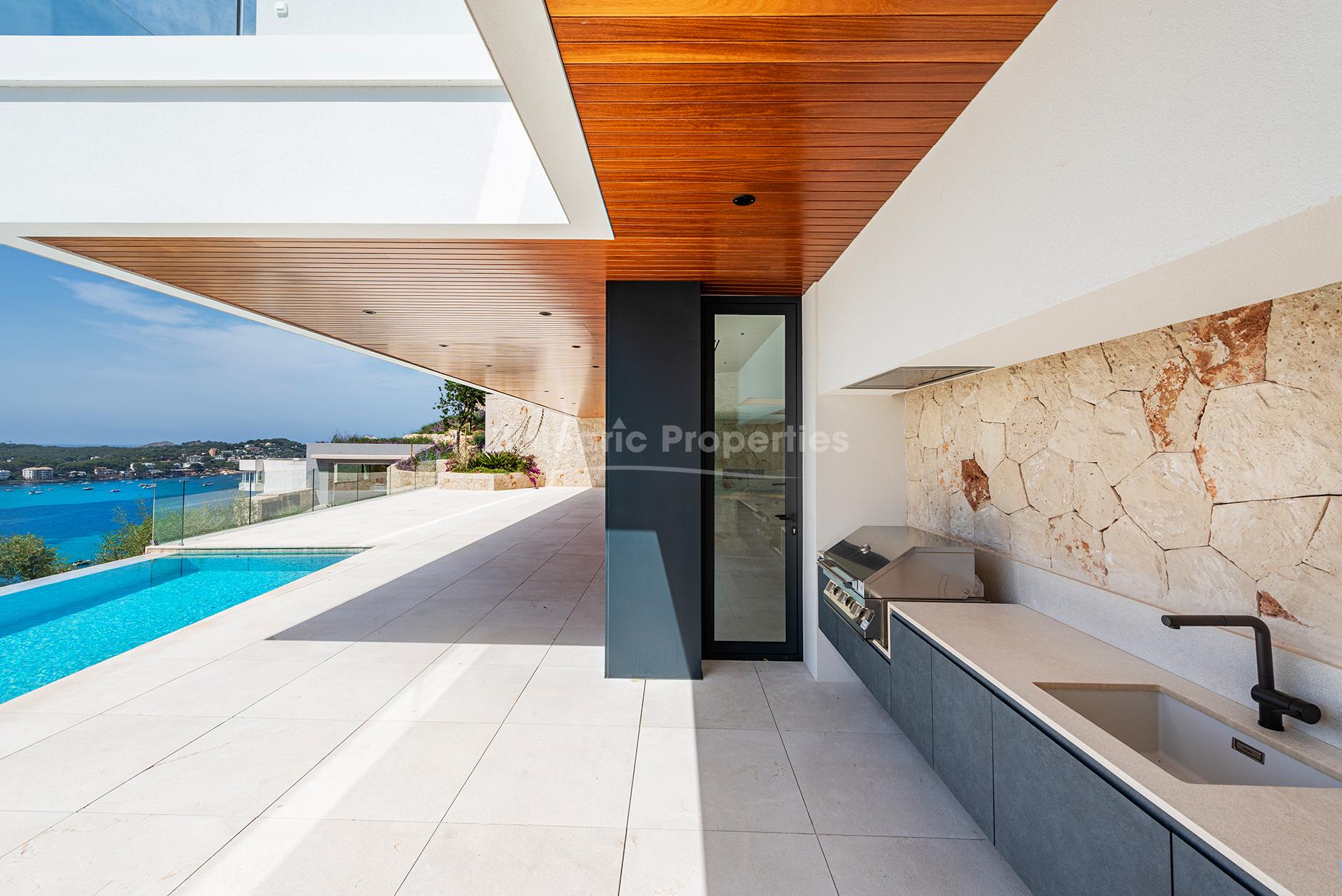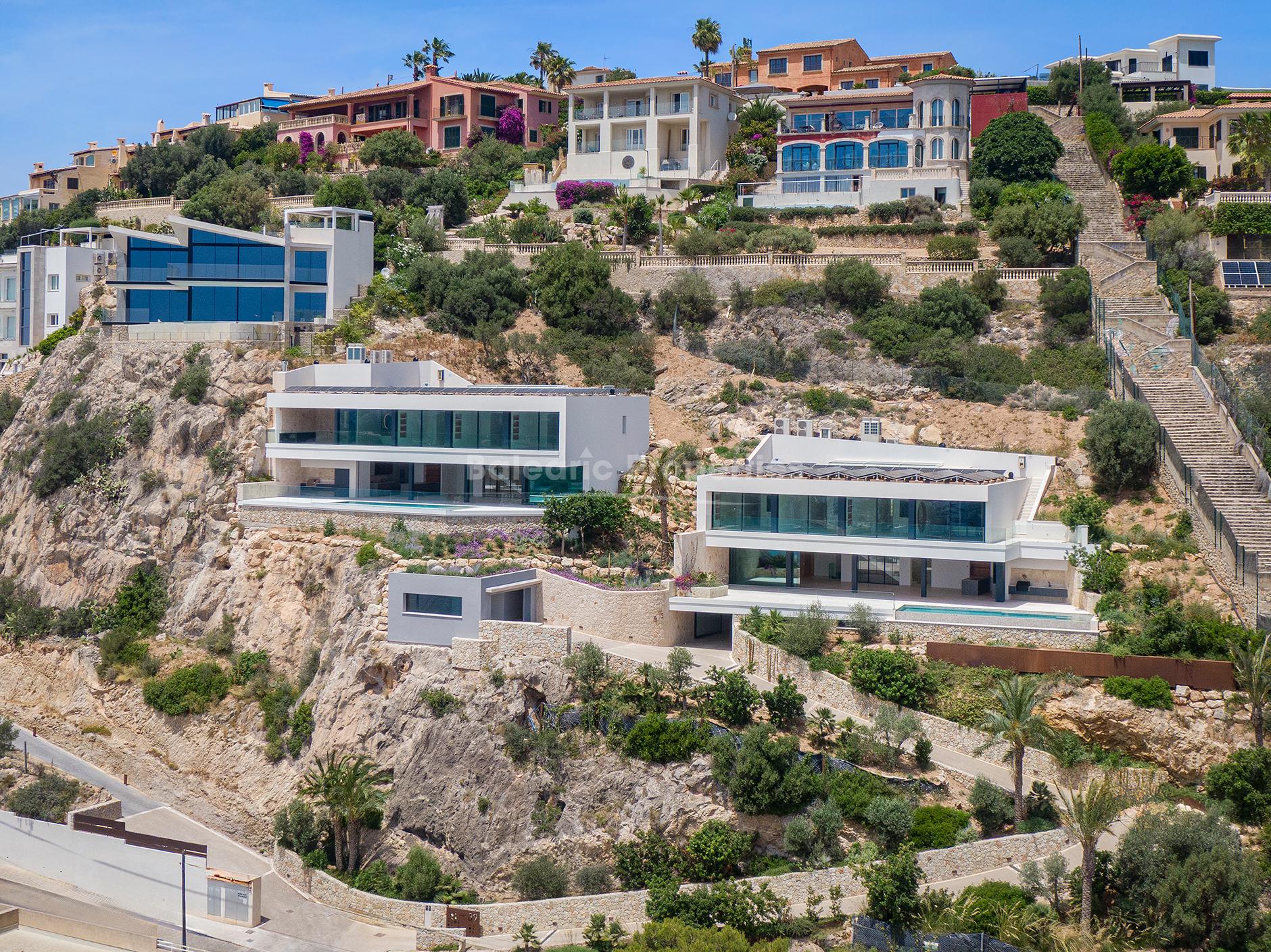 Diese moderne Villa, zum Verkauf in der begehrten Wohnlage Santa Ponsa, verbindet mediterranen Charme mit zeitgenössischer Architektur. Fertiggestellt im Jahr 2025 und auf drei Ebenen verteilt, ist die nach Süden ausgerichtete Immobilie den ganzen Tag über von reichlich natürlichem Licht durchflutet. Die erhöhte Lage bietet sowohl einen atemberaubenden Panoramablick auf das Meer, als auch auf die umliegenden Berge und schafft eine ruhige, offene Atmosphäre. Das Design legt Wert auf klare Linien, hochwertige Materialien und ein nahtloses Zusammenspiel von Innen- und Außenbereichen, das Haus ist ein elegantes und zugleich komfortables Familienheim.
