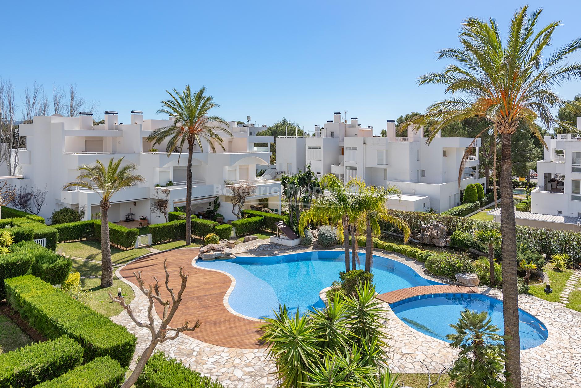 Das Leben im Freien ist ein besonderes Highlight, mit mehreren Terrassen in den oberen Etagen und einer überdachten Terrasse im Erdgeschoss, die sich zu einem privaten Garten mit direktem Zugang zum Gemeinschaftspool öffnet.