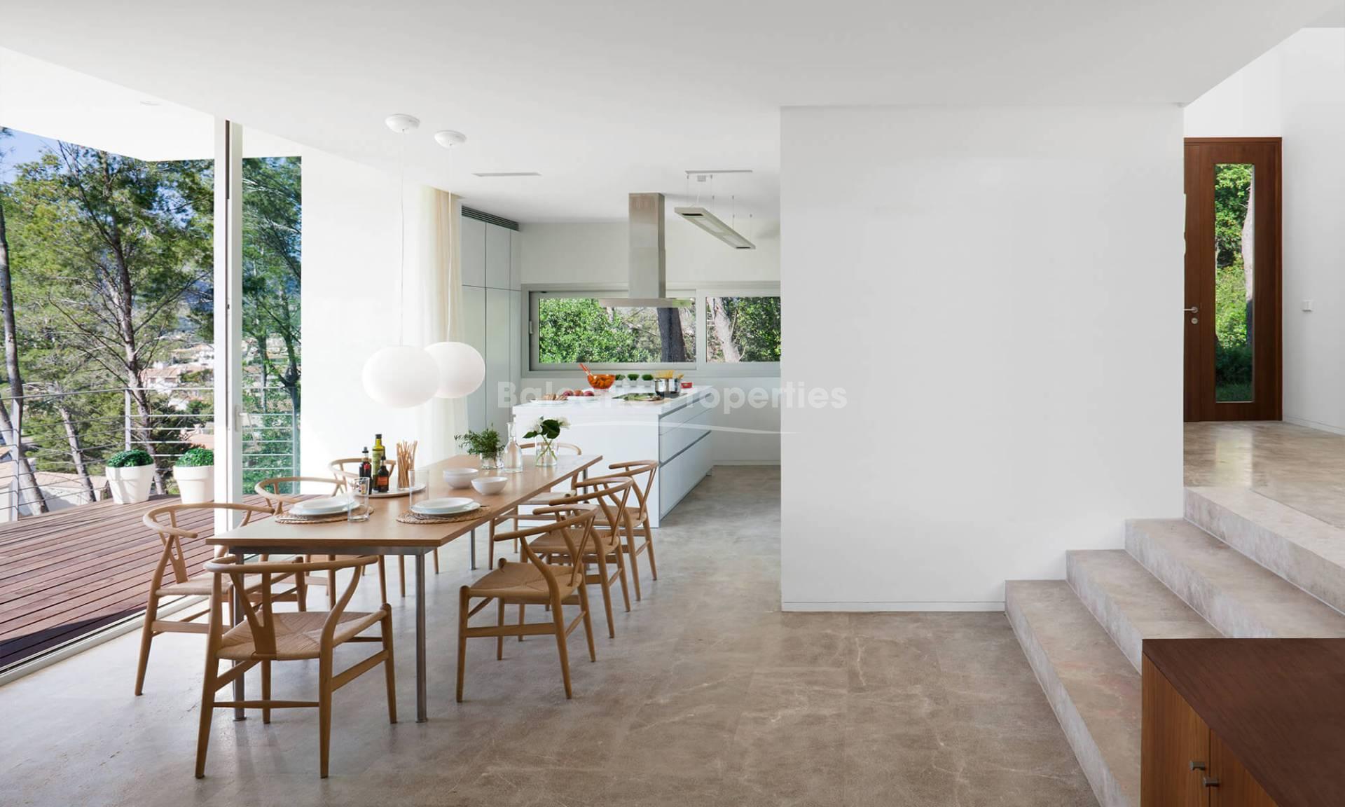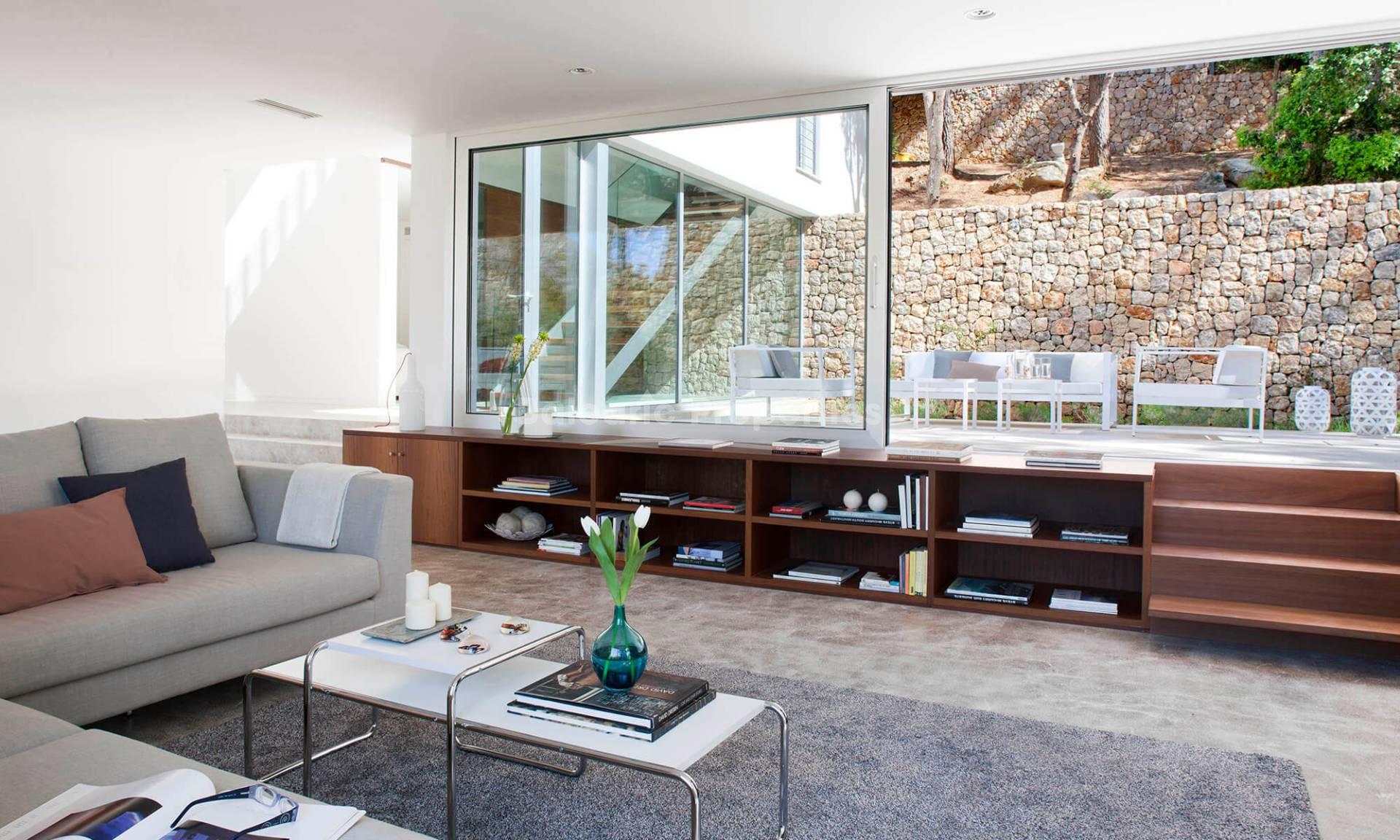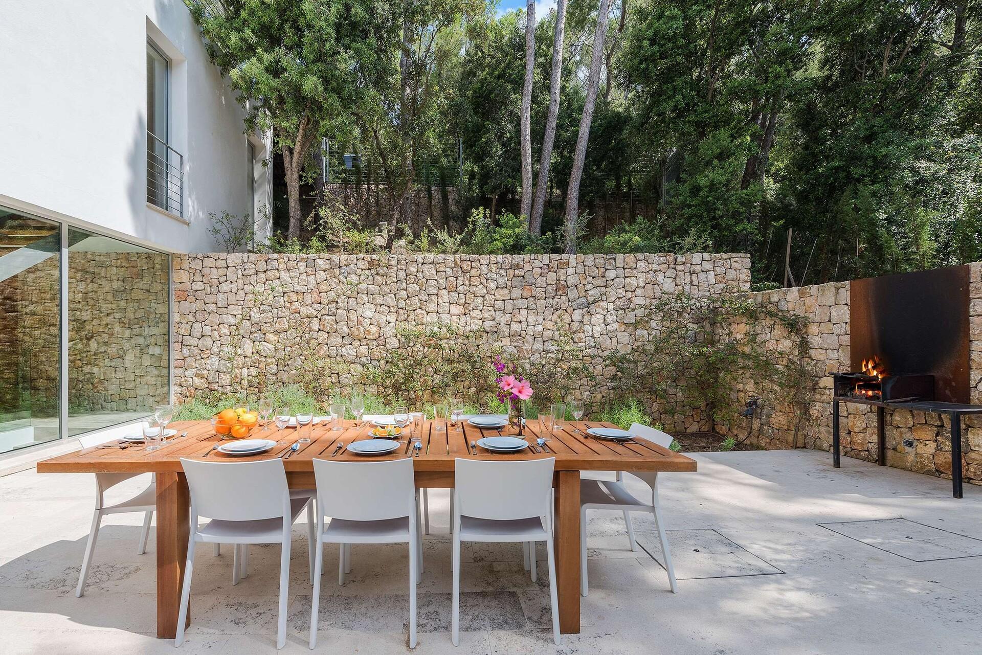 Ein Highlight des Außenbereichs ist der spektakuläre 14 m x 6 m große Infinity-Pool, der von einer eleganten Natursteinmauer geschützt und nachts wunderschön beleuchtet wird. Von den sonnigen Terrassen aus genießen Sie einen atemberaubenden Blick auf die nahe gelegene Serra de Tramuntana, die einen echten mediterranen Rückzugsort schafft.