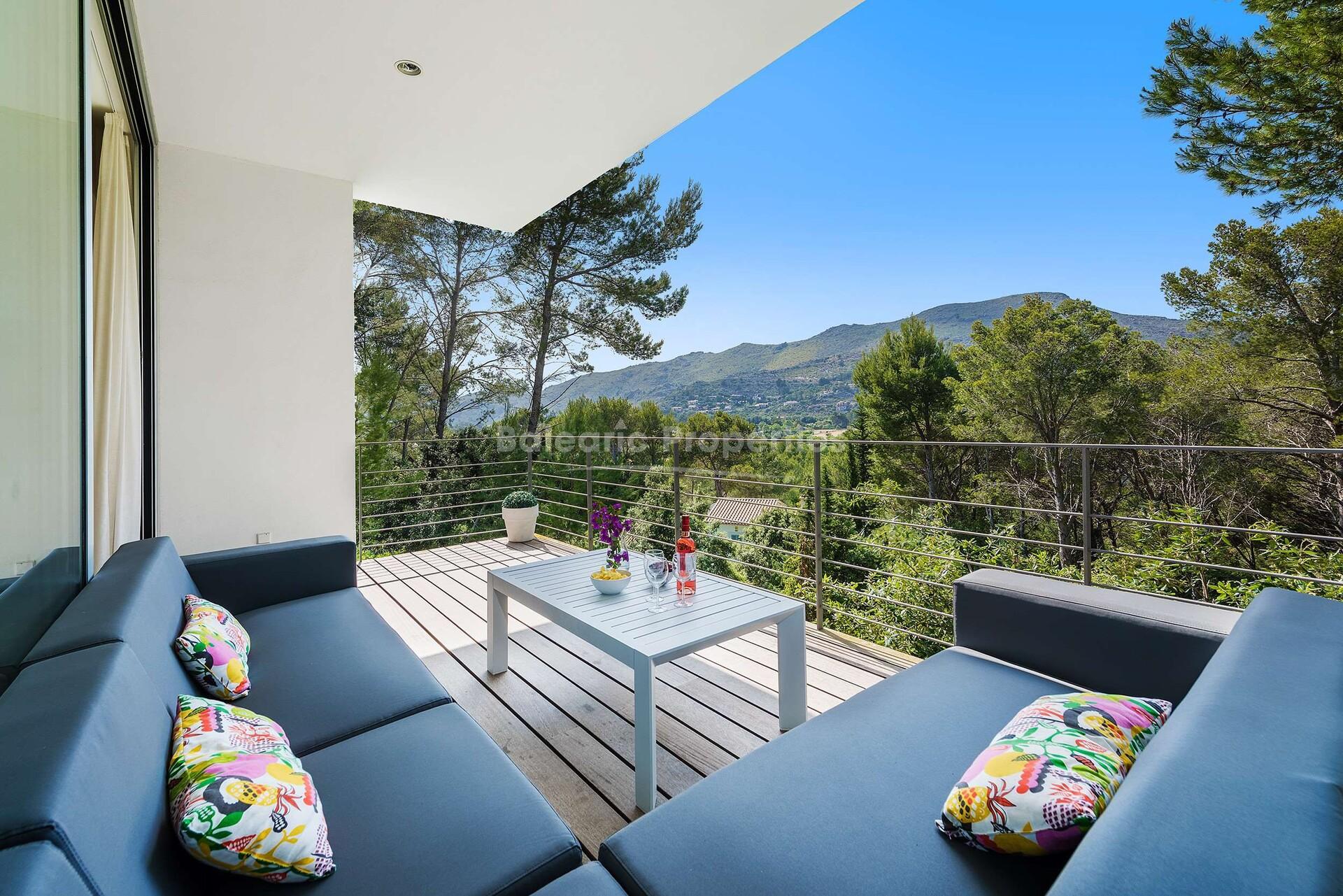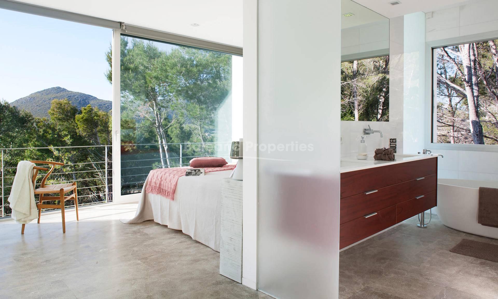 Diese außergewöhnliche moderne Villa mit Ferienvermietungslizenz befindet sich auf einem Hügel im schicken Ferienort Puerto Pollensa, einer der begehrtesten Gegenden im Norden Mallorcas. Diese Immobilie verbindet innovative Architektur mit minimalistischer Ästhetik und bietet luxuriöses Wohnen nur wenige Schritte von den goldenen Stränden der Bucht von Pollensa entfernt.