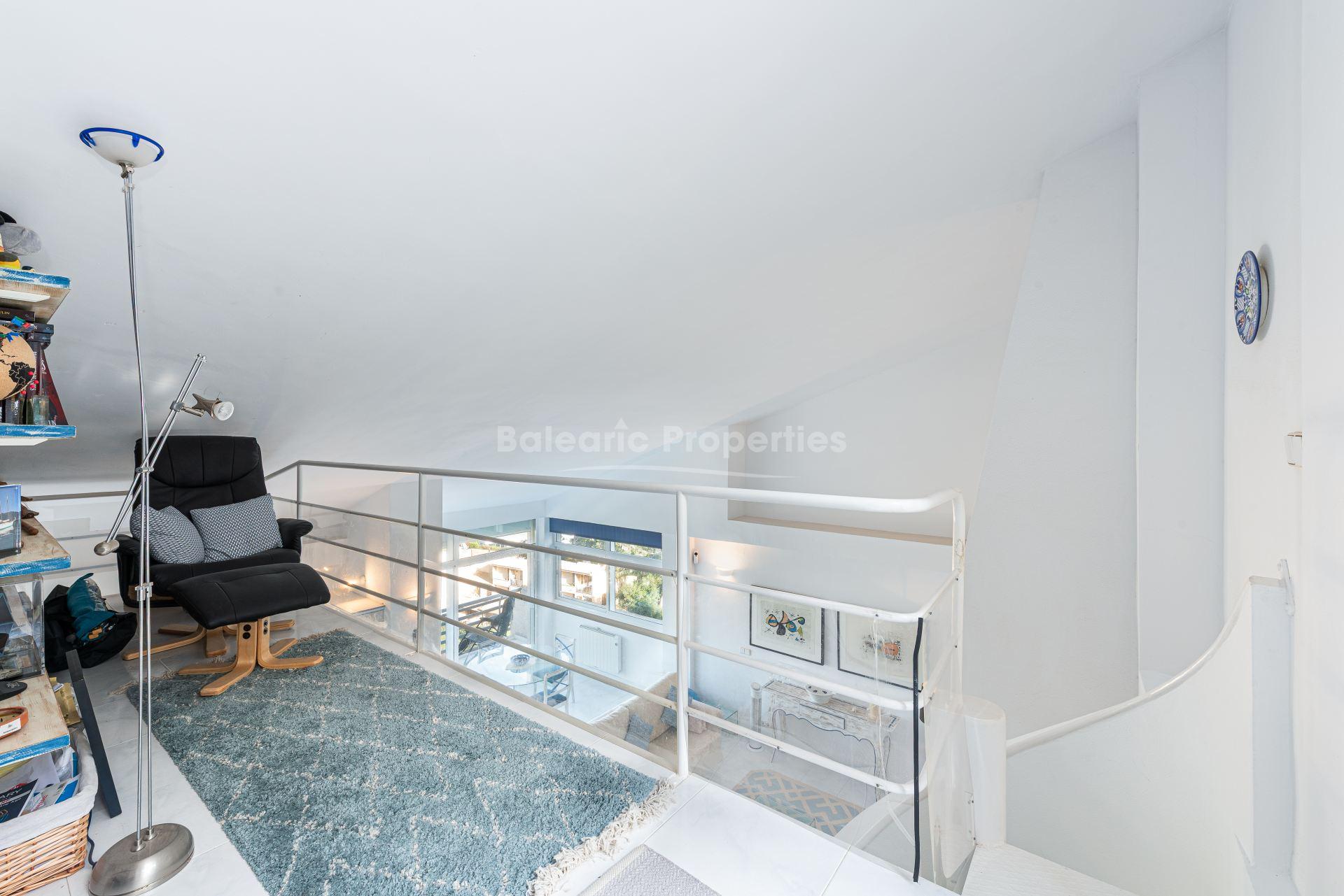 Eine obere Mezzanine sorgt für zusätzliche Vielseitigkeit und verfügt über ein Gäste-WC sowie direkten Zugang zu einer beeindruckenden privaten Dachterrasse. Dieser erhöhte Außenbereich bietet die perfekte Umgebung zum Sonnenbaden, zur Bewirtung von Gästen oder einfach um die atemberaubenden Küstenlandschaft und mediterrane Sonnenuntergänge zu geniessen.