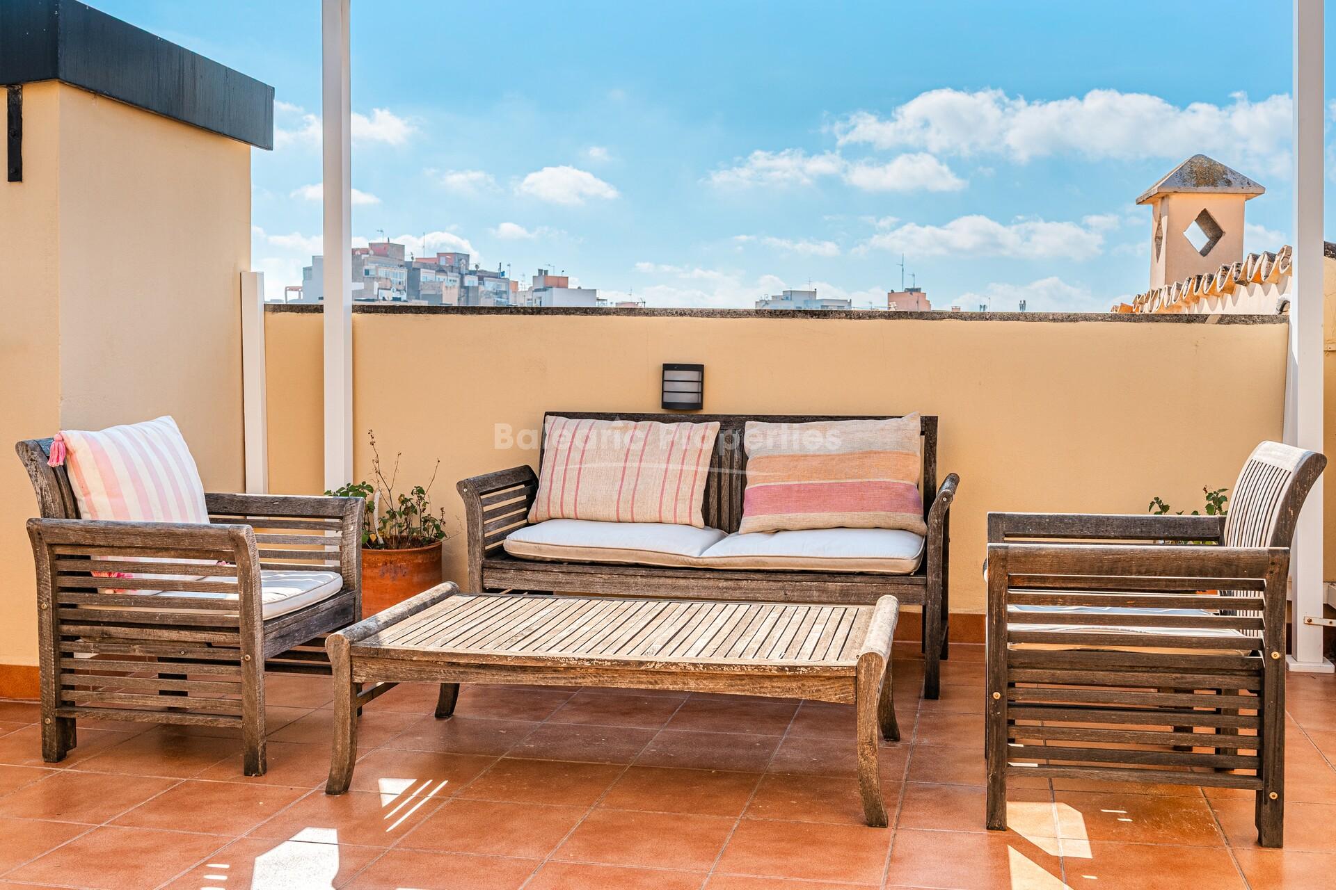 Gelegen an der lebhaften Calle Sindicat im charmanten Altstadtviertel von Palma, steht diese wunderschön präsentierte Dachgeschosswohnung zum Verkauf in einem exklusiven Wohngebäude mit nur vier Wohnungen. Sie bietet sowohl Privatsphäre als auch Komfort, mit direktem Zugang per Aufzug, der mit einem sicheren privaten Schlüssel bedient wird, damit ist ein hohes Maß an Sicherheit und Exklusivität gewährleistet.