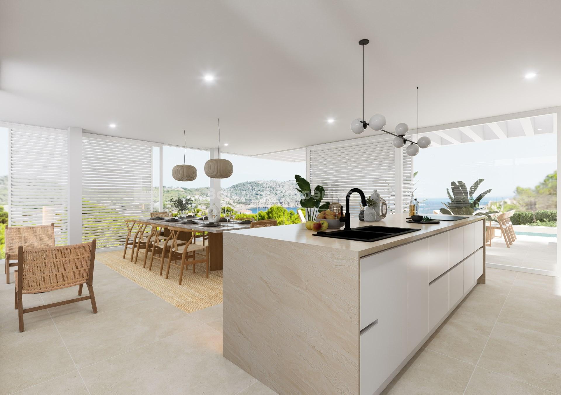 On the first floor are two double bedrooms with en-suite bathrooms and fitted wardrobes; the master bedroom has a balcony of approx. 7m2. This level also has a generous living room that seamlessly integrates with an open-plan kitchen and cooking island. Large windows and doors flood the space with natural light and offer direct access to an 18m2 terrace and a pool measuring approximately 7m2, where you can relax and take in the stunning views of Palma Bay.