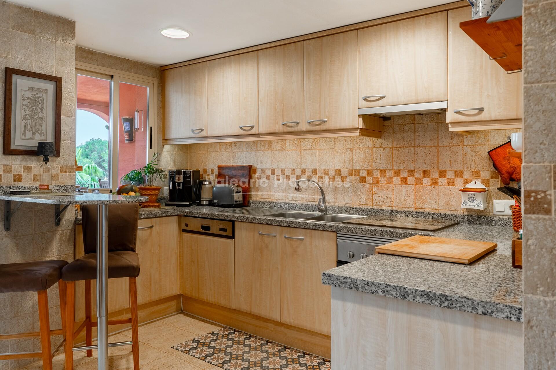This well-presented penthouse is located on the third floor of an attractive residential community in Santa Ponsa, offering direct access to a renowned golf course. Maintained in good condition, the property reflects a timeless Mediterranean style with a southwest orientation that ensures abundant natural light throughout the day. Its elevated position provides pleasant open views over the golf course, as well as the communal pool and landscaped gardens. The setting combines privacy with a sense of openness, ideal for both permanent living and holiday use.