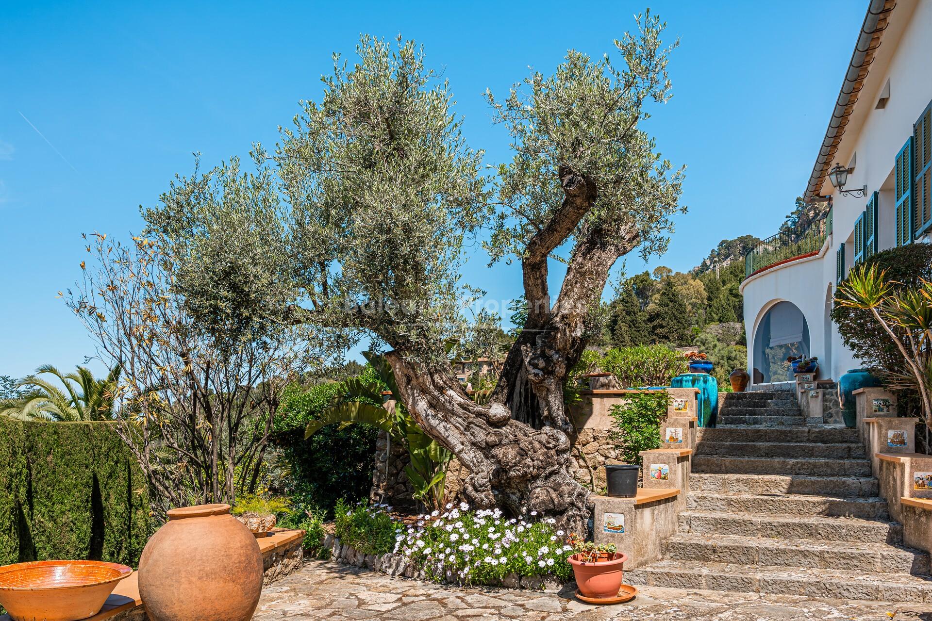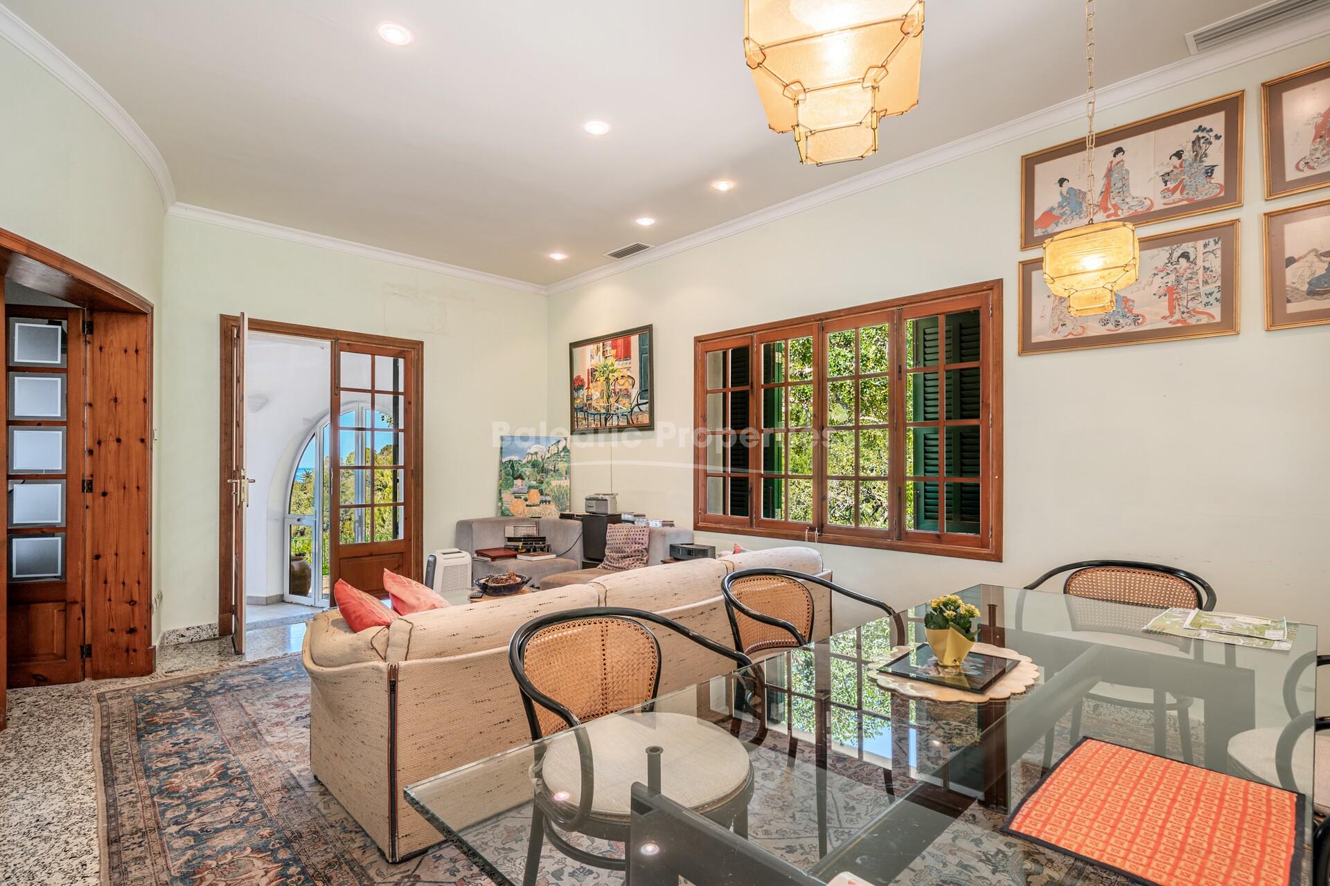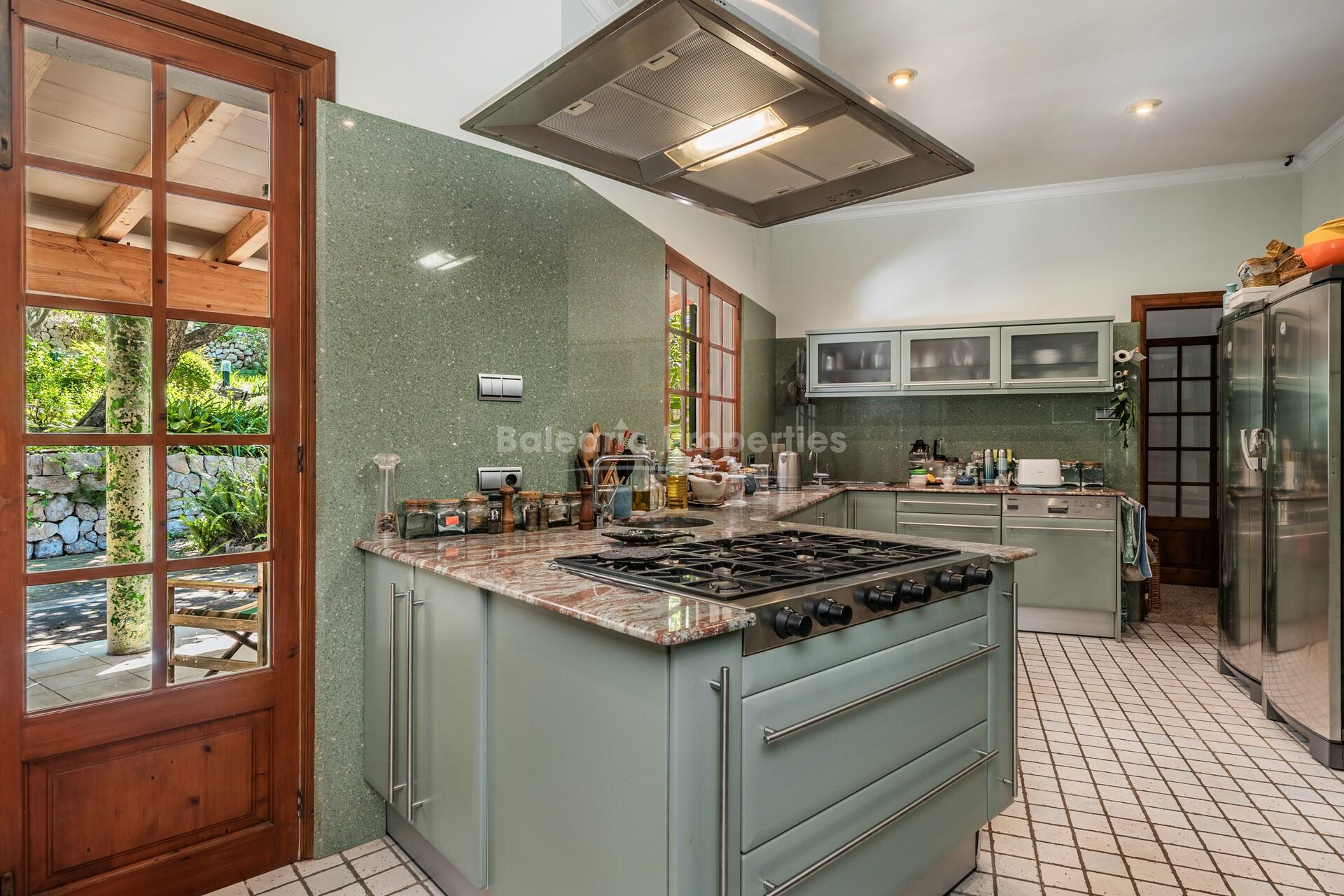 Situated in a tranquil, tree-lined setting, this property is for sale in Deià, is on a generous 15,000 m² plot that offers ample privacy and numerous design possibilities. The well-maintained gardens feature natural pathways and an outdoor dining area beneath a vine-covered pergola, creating a peaceful atmosphere where nature and tranquillity come together beautifully.