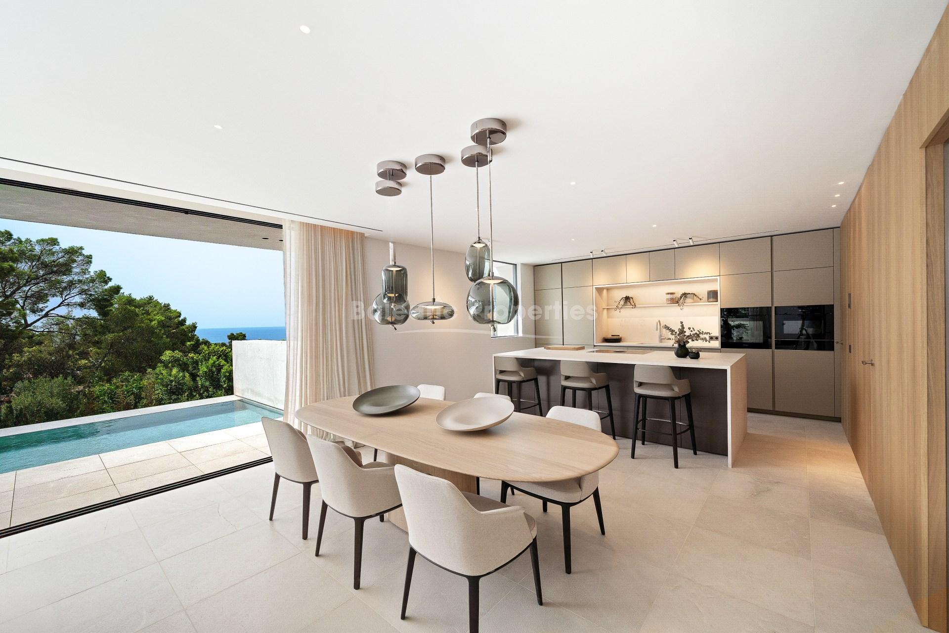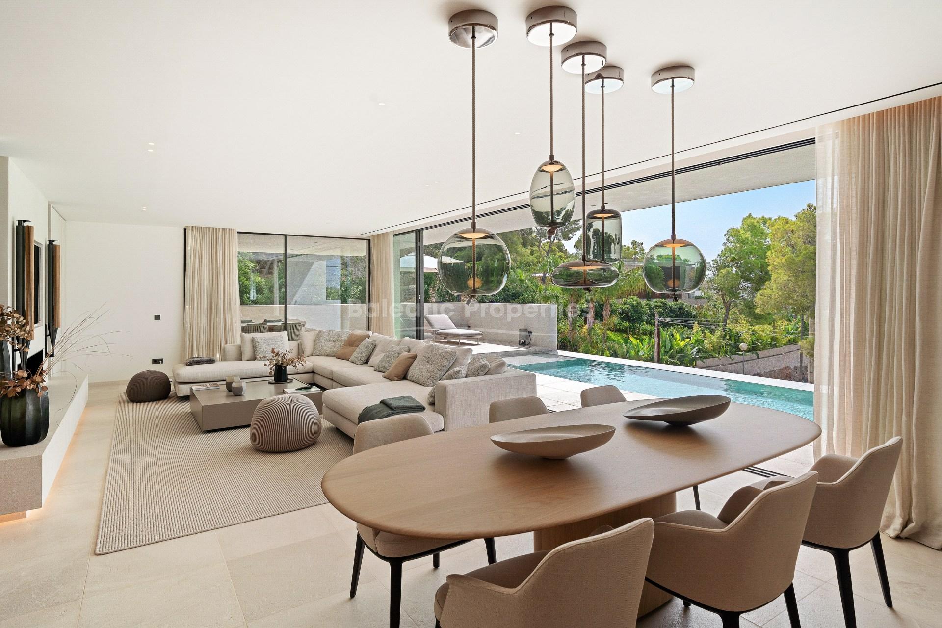 Esta villa de nueva construcción, ahora a la venta, en el encantador pueblo de Portals Nous ofrece una combinación excepcional de diseño moderno, luz natural y acabados de alta gama. Su finalización está prevista para finales de agosto de 2025, y la propiedad se organiza en torno a un elegante patio interior que aporta una atmósfera luminosa y abierta en toda la vivienda. Su orientación sur garantiza una excelente entrada de luz solar durante todo el día, mientras que las vistas al mar desde la planta superior y los tranquilos jardines que la rodean aumentan su atractivo.