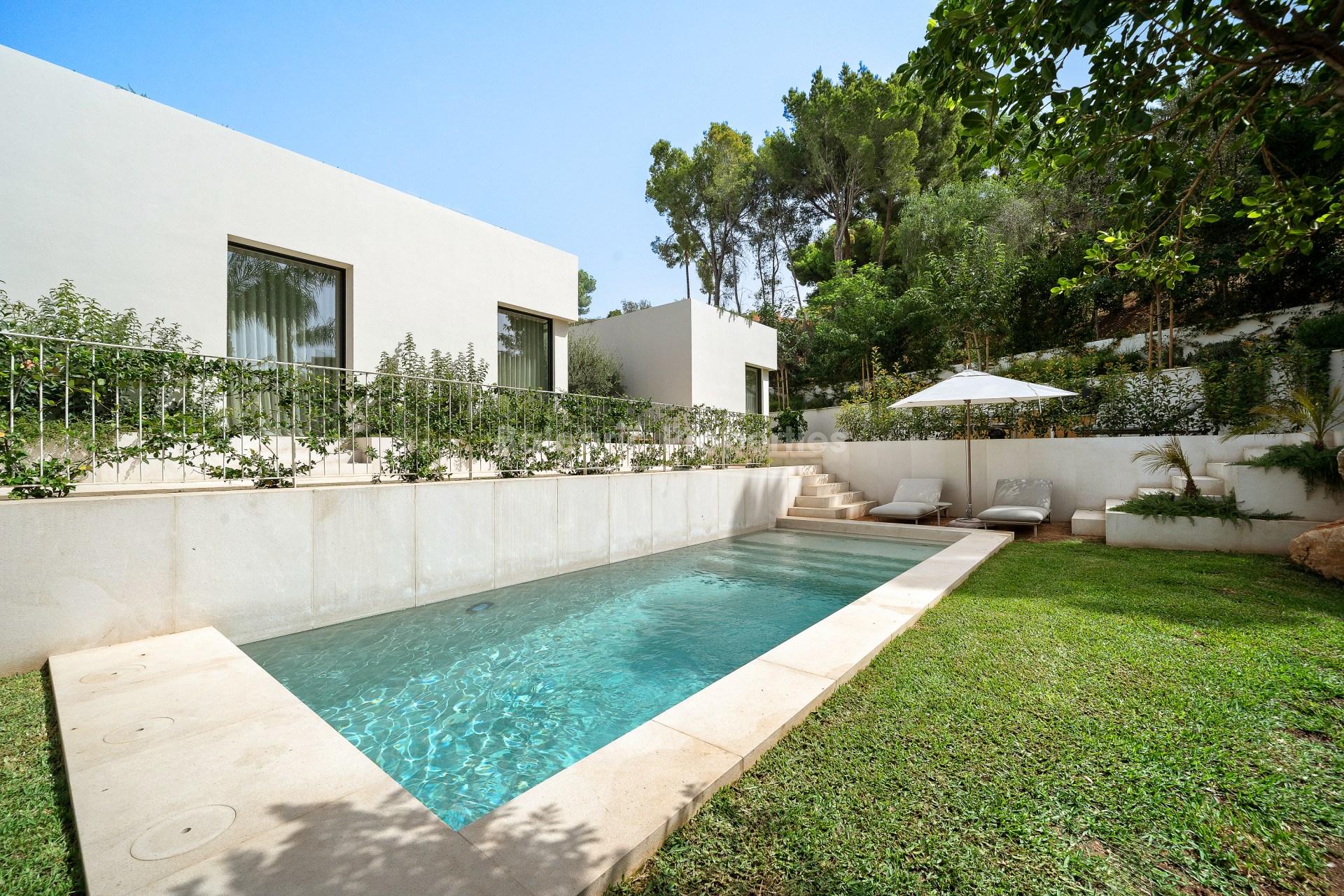 Distribuida en dos plantas más sótano, la villa está conectada por un ascensor e incluye un garaje con capacidad para tres vehículos. Dispone de cuatro amplios dormitorios, una oficina independiente y una habitación de invitados con baño en suite ubicada en el sótano. Se han utilizado materiales de alta calidad, como piedra natural y suelos de roble, además de calefacción por suelo radiante y aire acondicionado integrado.
