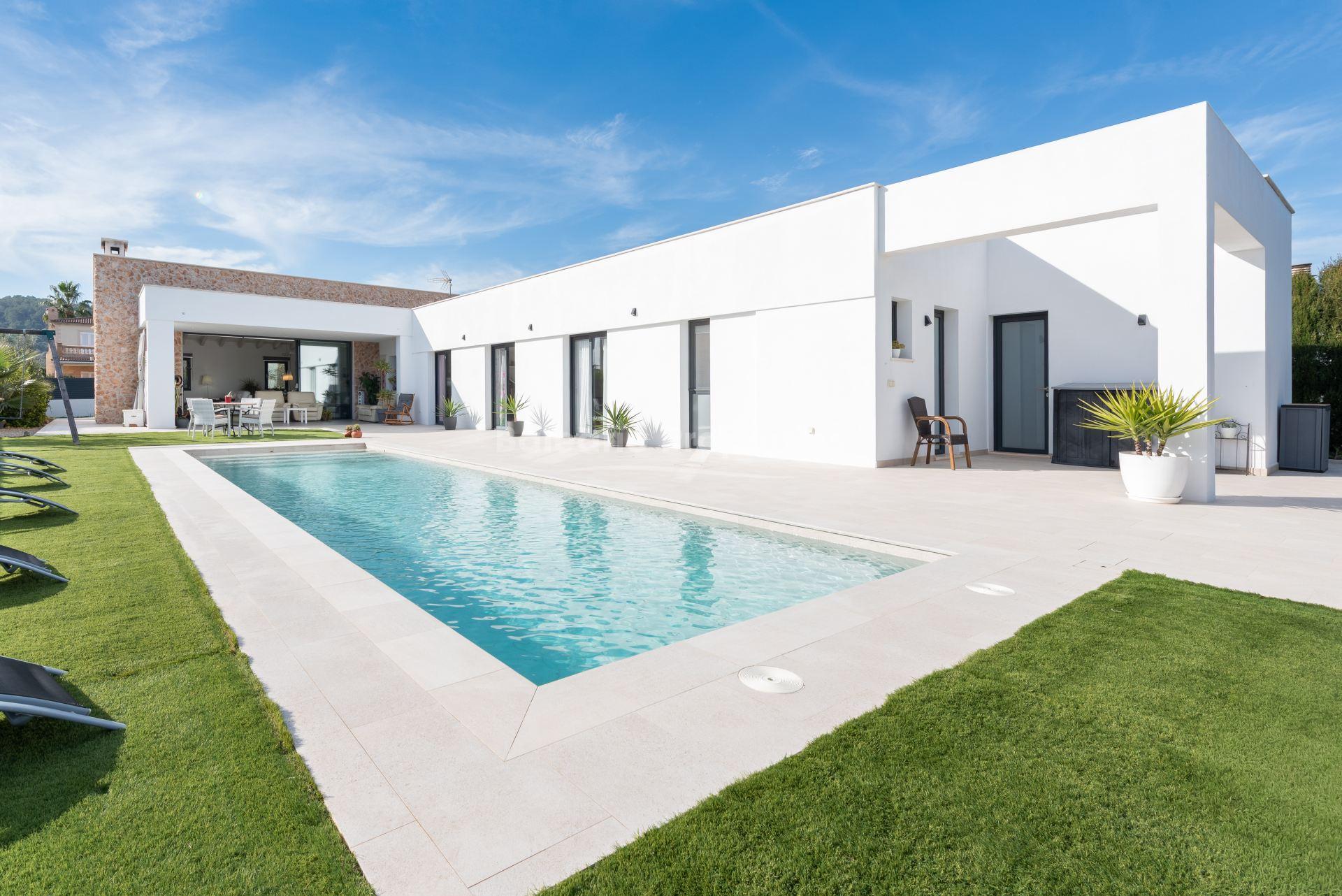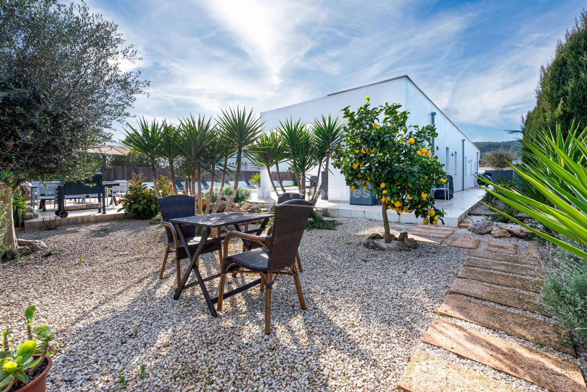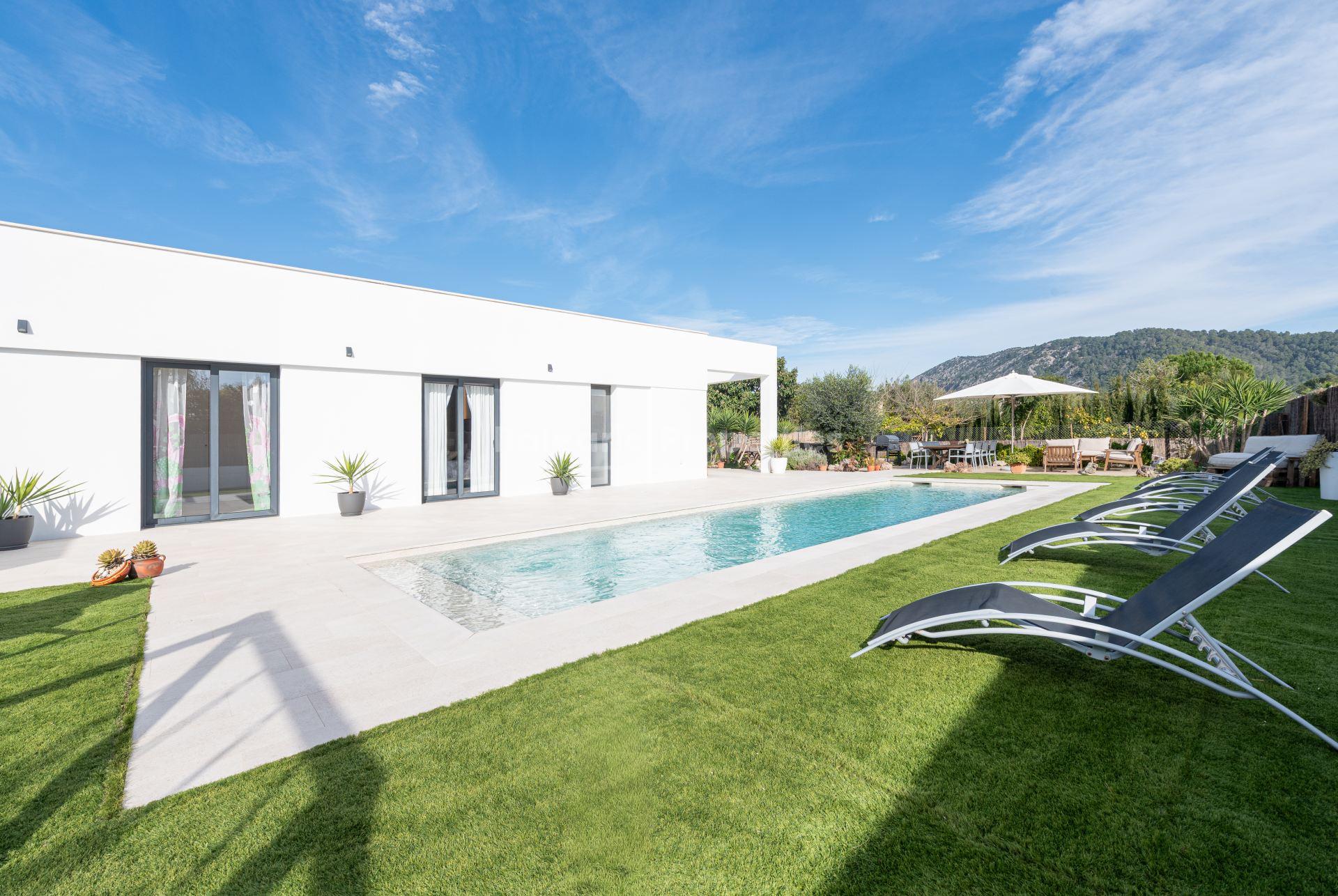 En el corazón de la vivienda se encuentra un amplio salón con cocina de concepto abierto, creando un espacio luminoso y aireado que conecta sin esfuerzo con el exterior a través de grandes puertas de cristal. Estas puertas conducen directamente a la atractiva zona de la piscina, un lugar ideal para relajarse y disfrutar del agradable clima mediterráneo. Junto a la cocina, una práctica lavandería mejora la funcionalidad del hogar.
