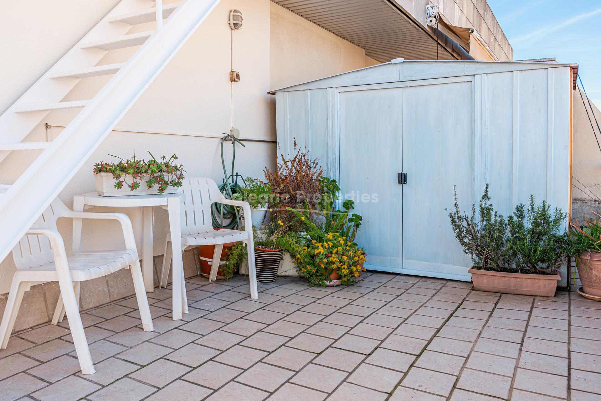 Una característica destacada de este apartamento es la generosa terraza en la azotea, también de aproximadamente 80 metros cuadrados, que ofrece impresionantes vistas al mar. Este espacio es ideal para comenzar el día desayunando al sol, relajarse con un buen libro por la tarde o pasar noches agradables bajo el cielo mallorquín.
