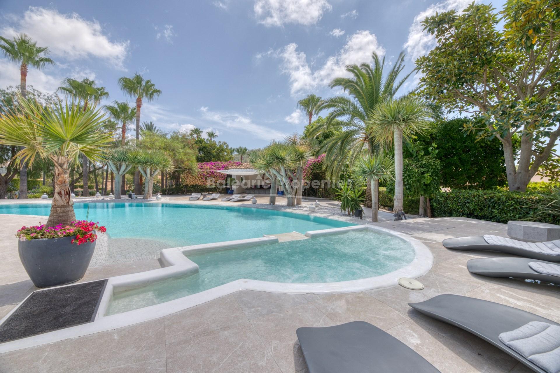 El jardín mediterráneo es perfecto para el entretenimiento, con una gran piscina, un espacioso jacuzzi y una zona de bar al aire libre. Dos garajes dobles y un amplio aparcamiento adicional completan esta excepcional propiedad en primera línea de golf en Santa Ponsa, cerca de las playas, los puertos deportivos, Palma y el aeropuerto internacional.