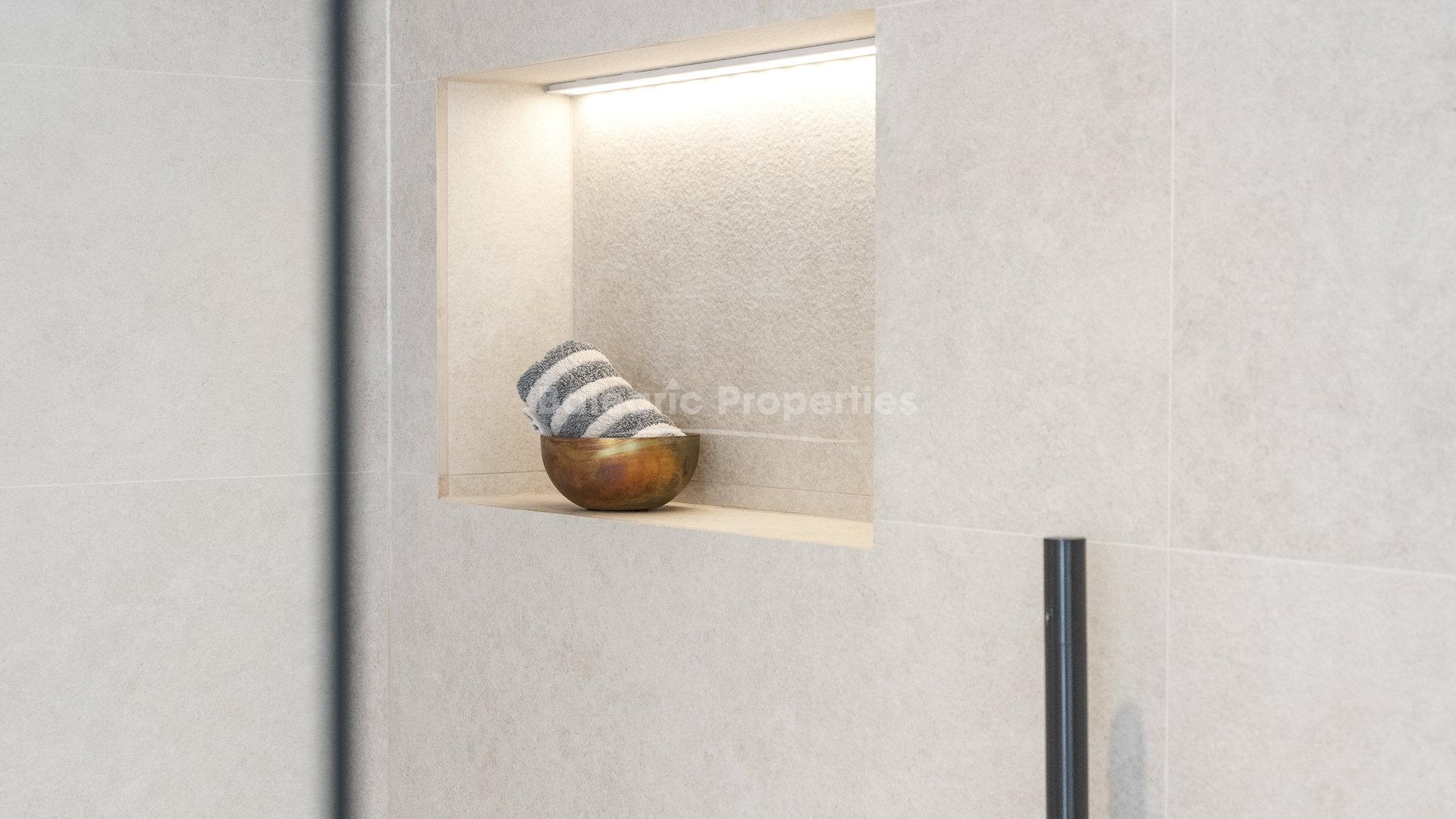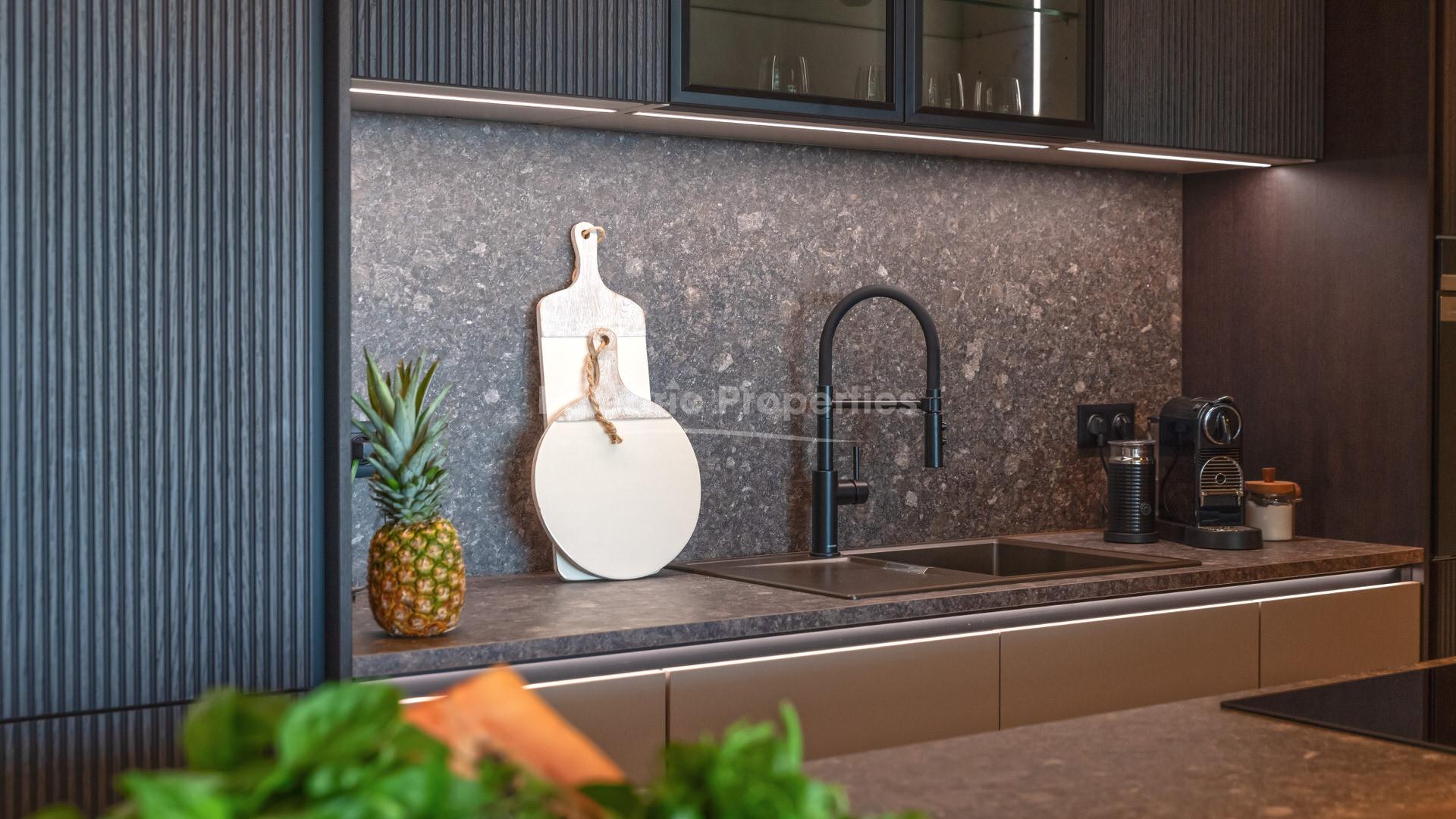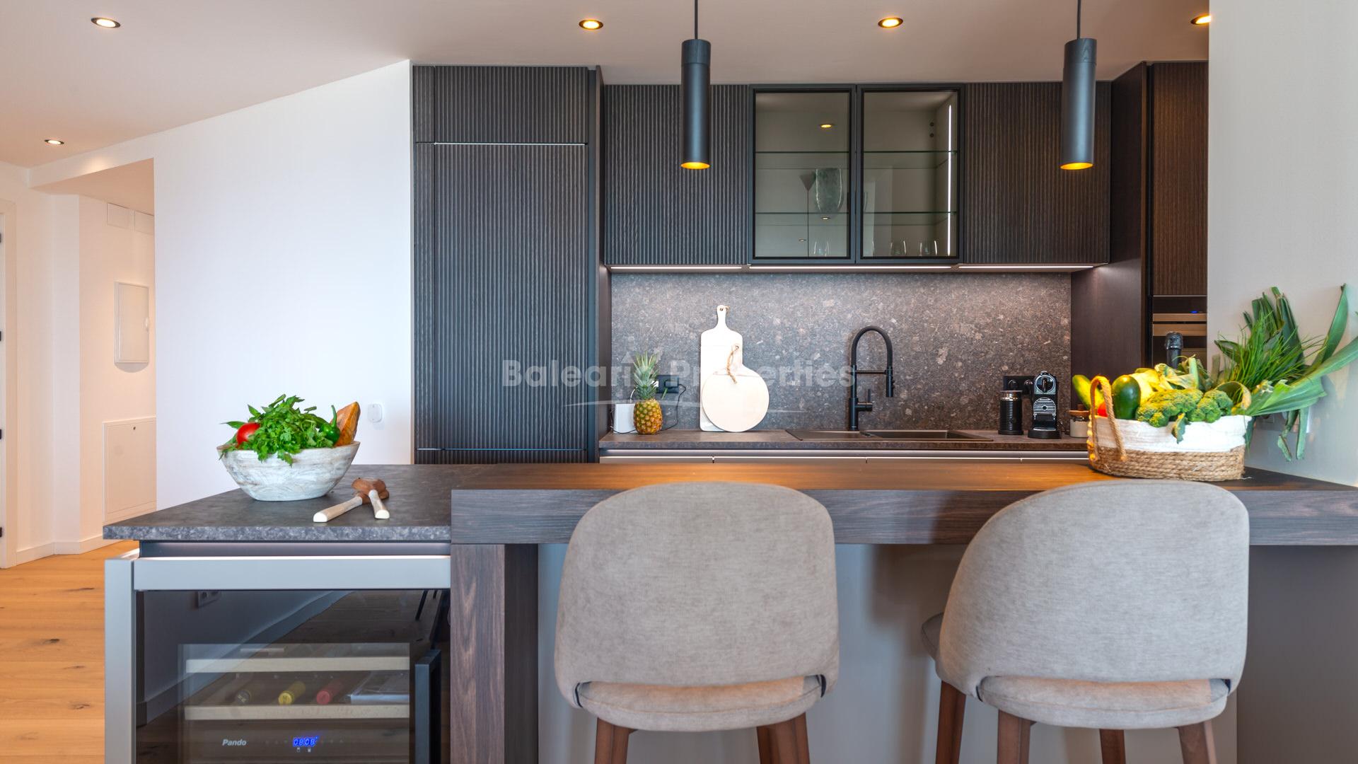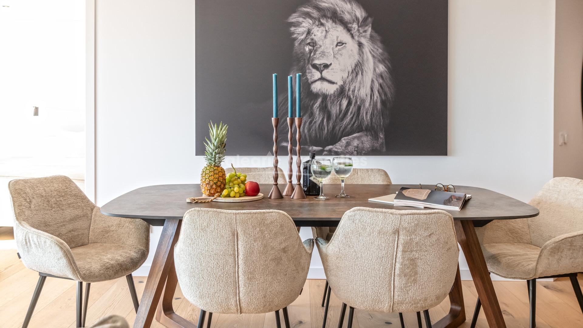 El interior está cuidadosamente distribuido y cuenta con tres dormitorios bien proporcionados y dos baños, diseñados para maximizar el confort y la practicidad. Suelos de madera de alta calidad y gran durabilidad de 12 mm recorren toda la vivienda, complementados por ventanas de aluminio con doble acristalamiento, calefacción por suelo radiante y aire acondicionado. La cocina moderna está totalmente equipada con electrodomésticos de alta gama de Bora y Siemens, junto con mobiliario de Nolte, y se integra perfectamente con la zona de estar. Entre otras características destacan una terraza de 21 m² con vistas al mar, despensa, persianas eléctricas y un sistema de sonido conectado por Wi-Fi. La propiedad se vende completamente amueblada con marcas italianas seleccionadas.