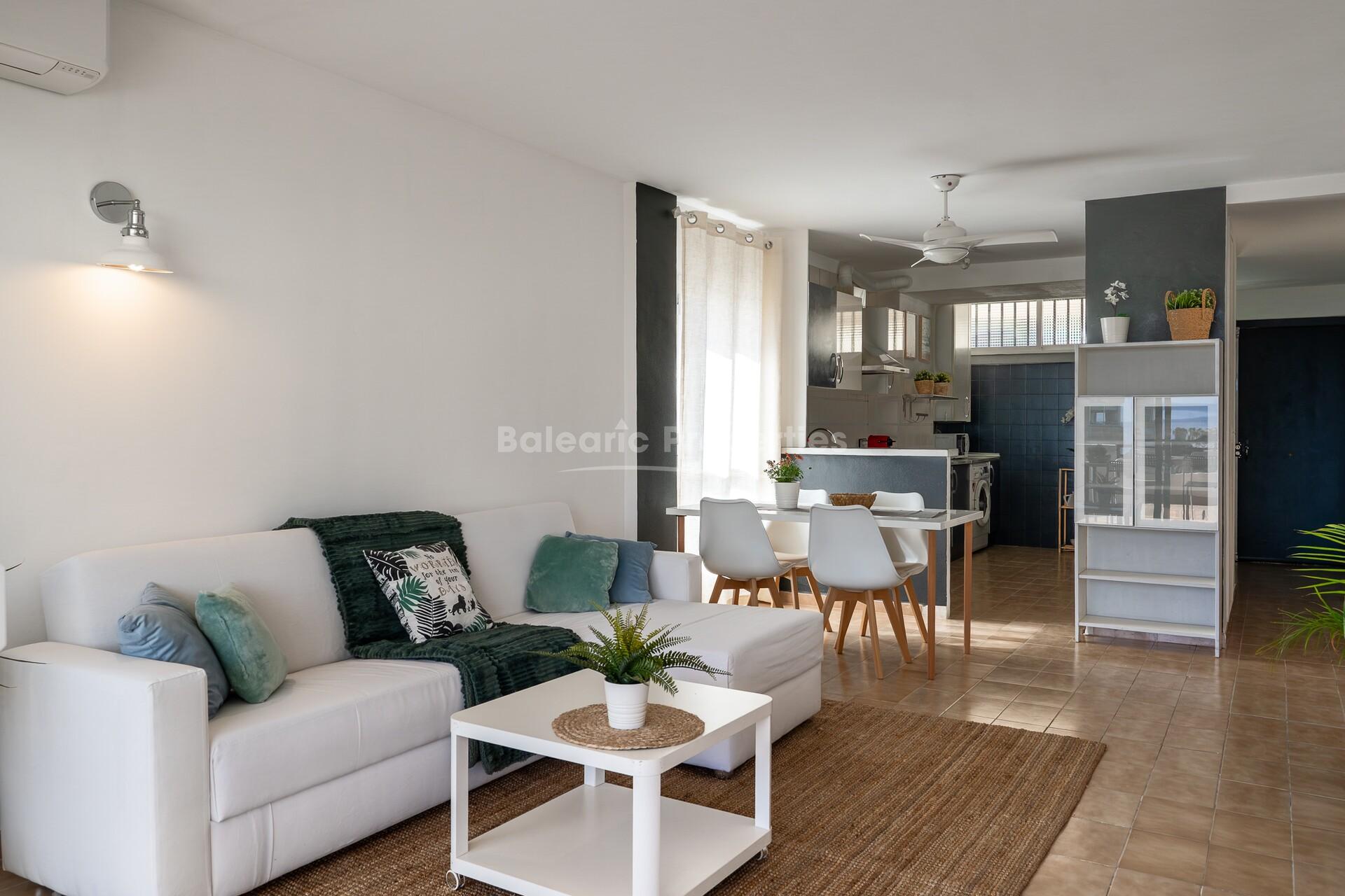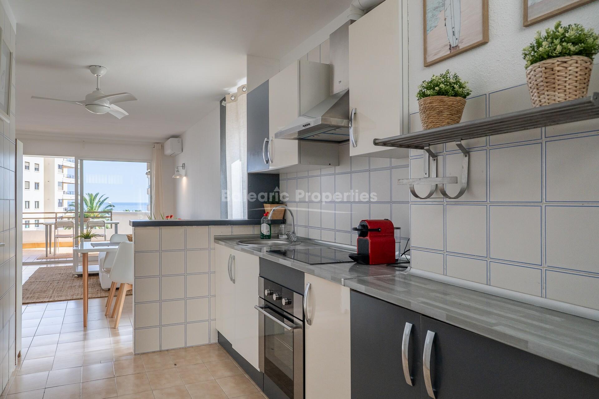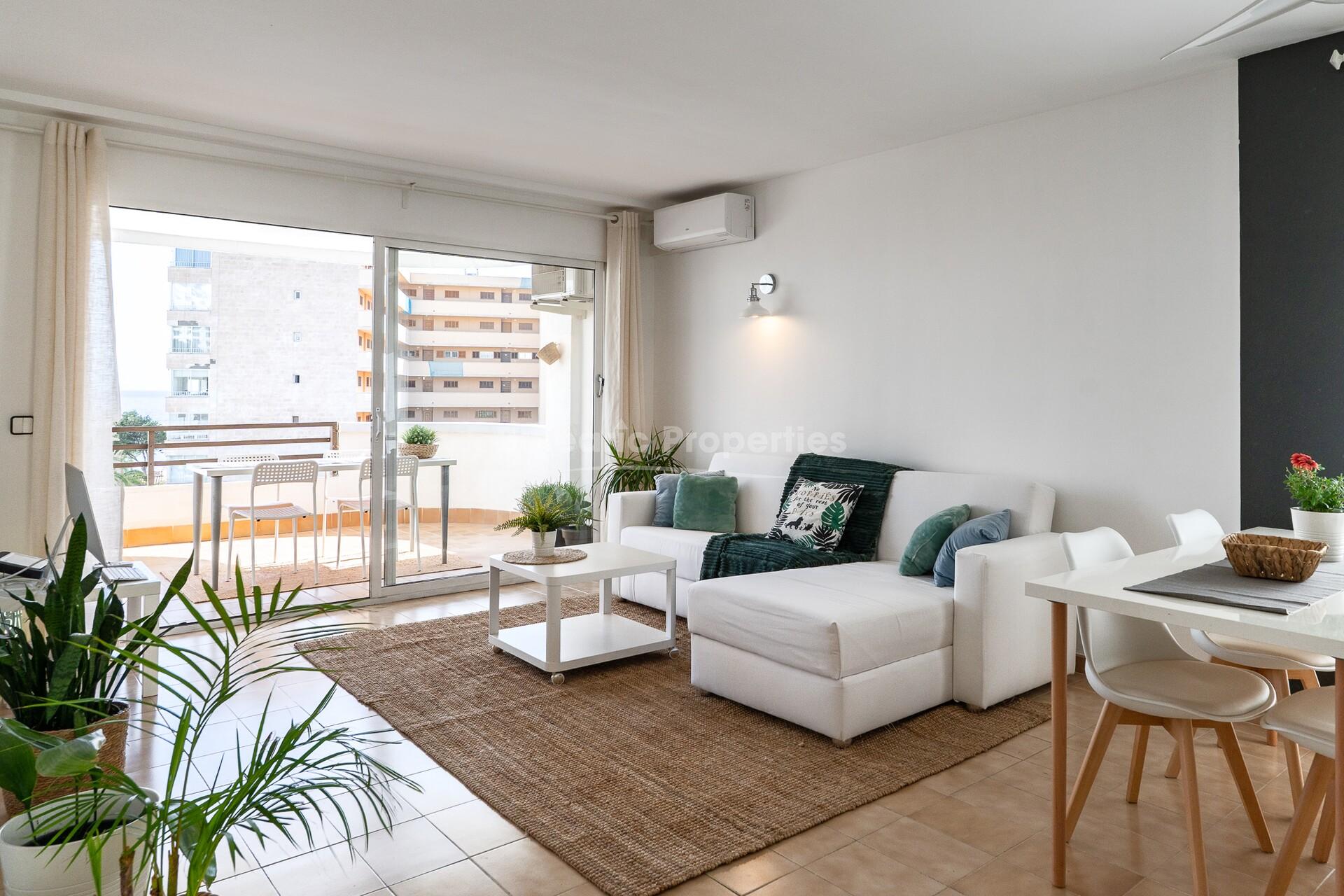 El apartamento goza de orientación sur, lo que permite una gran entrada de luz natural durante todo el día y ofrece agradables vistas al mar. El interior cuenta con un luminoso salón-comedor diáfano con aire acondicionado, que da directamente a la amplia terraza – ideal para cenar al aire libre, relajarse o disfrutar del clima mediterráneo.